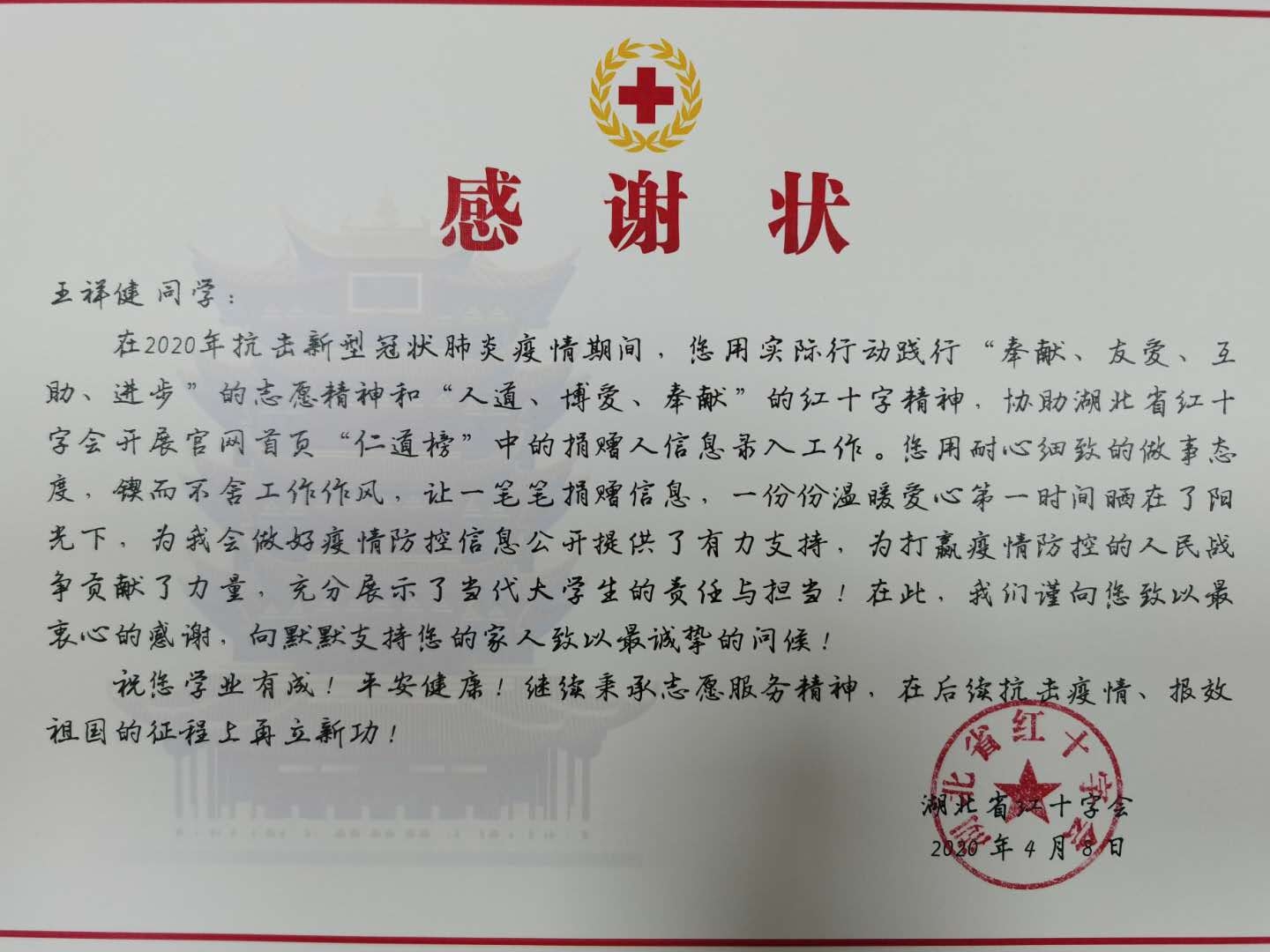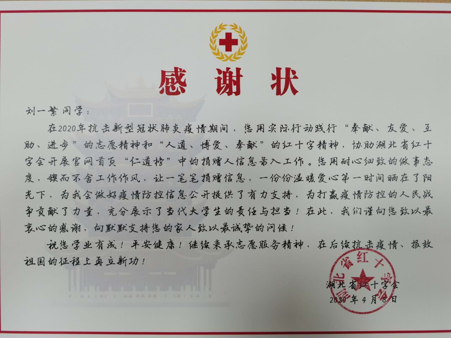 点击:近日,成人文学 团委收到湖北省红十字会发来的感谢信,对成人文学 团委以及安全定单2017级张纪扬、安全工程2017-3班刘一繁、安全应急2018级王祥健三名同学在疫情防控工作中作出的贡献表示由衷的感谢。