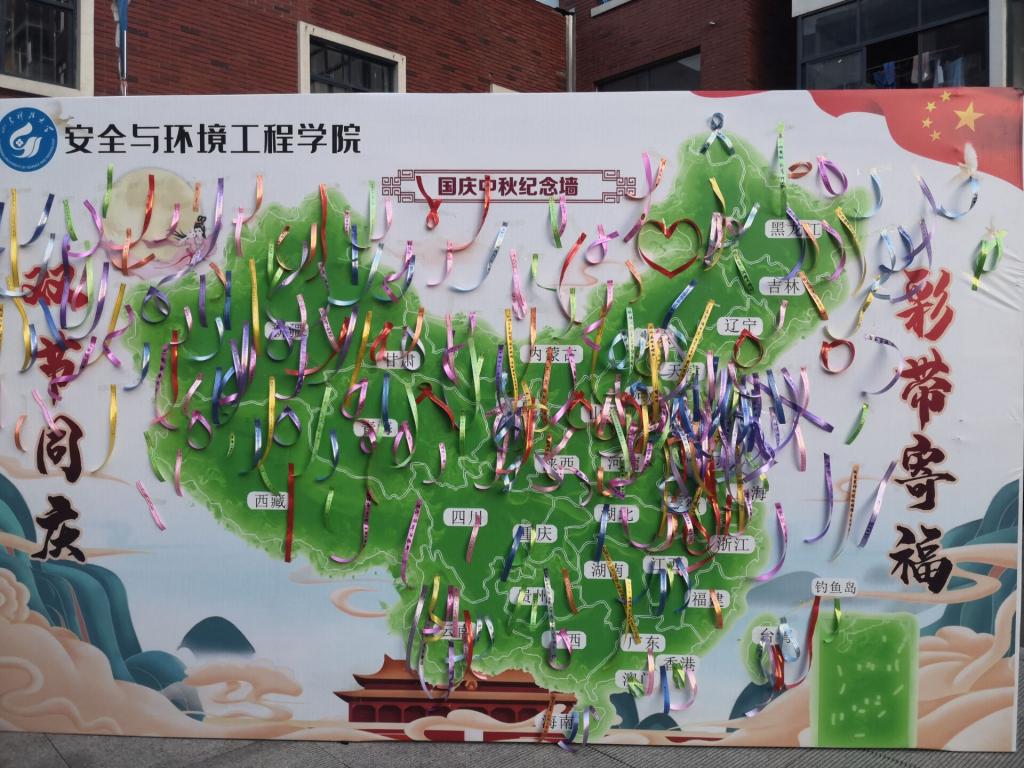 活动现场,安全学子用彩带在“双节同庆,彩带寄福”表白墙上写下了自己对祖国的热爱和对家人思念。“祝福祖国母亲繁荣永昌,希望自己可以用所学保卫祖国长盛久安!”2020级新生们也在彩带上写下了自己对大学生活的憧憬和对未来美好生活的愿想。美好的祝福随着五彩斑斓的彩带飞舞在中华民族的地理版图上,在阳光照耀下显得格外熠熠生辉。