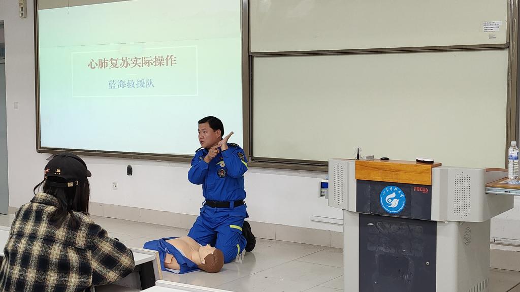 此次培训活动分为理论和实操两部分。会上,蓝海救援队培训老师以生动的语言、真实的案例,围绕突发事件,结合大学生日常学习和生活,分别就溺水、车祸、自然灾害等偶遇突发事件和心肺复苏、创伤急救包扎的科学抢救办法等进行了详尽的讲解。在随后的实际操作中,培训老师通过示范操作,手把手、一对一指导,让参训的学生熟悉并掌握心肺复苏、创伤急救包扎的科学要领和注意事项,并且耐心解答同学们提出的问题,指出同学们在实际操作中的不足。在场同学们认真聆听、仔细记录并踊跃参与模拟操作,力争使每一个实操动作标准、到位。
