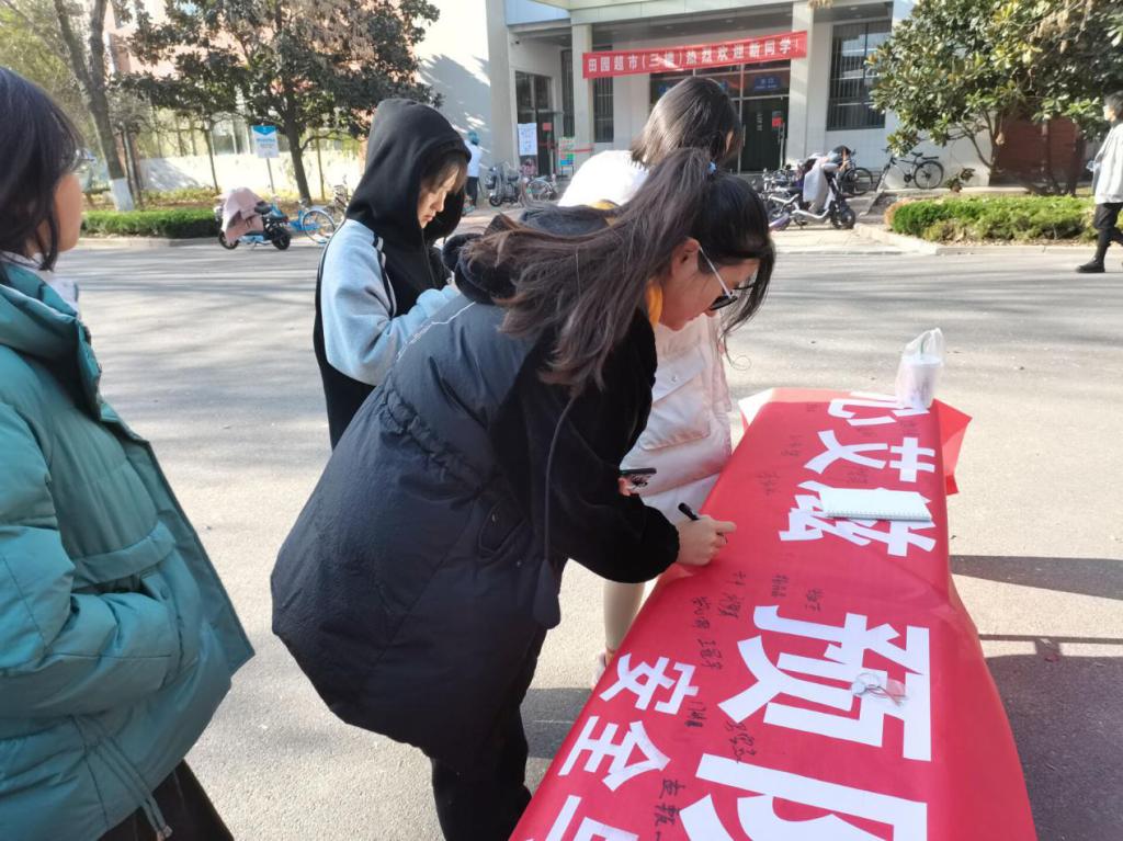 活动采取线上答题、线下签名相结合的方式,通过完成网络平台上的相关问题来夯实学生艾滋病预防工作基础,增强广大青年学生的防病意识和自我保护能力。同时为进一步深化此次线上教育活动,学院青年志愿者协会为参加活动的同学们准备了“关心艾滋,预防艾滋”主题条幅,每位完成线上答题的同学都可在横幅上进行签名并留下寄语。随着时间点点流逝,横幅上的名字愈加增多,预防艾滋病的相关知识铭记于同学们心间,横幅前也留下了同学们坚毅的身影。