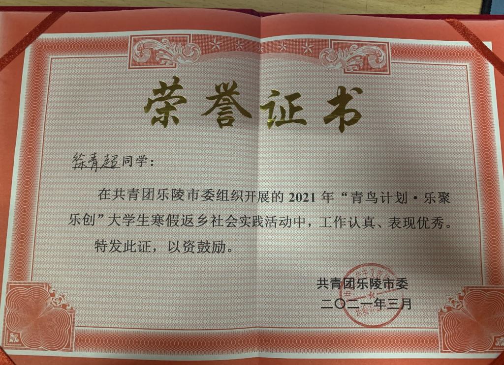 点击:蓬山此去无多路,青鸟殷勤为探看。近日,成人文学 收到一份“青鸟计划”的荣誉证书,作为对安全应急2018级徐青超同学在“青鸟计划”大学生社会实践过程中为家乡政府中做的工作的认可。