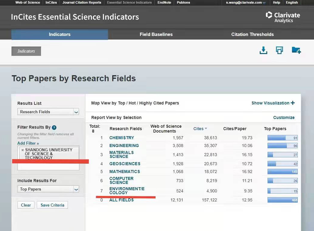 点击:3月10日,科睿唯安公布了ESI(Essential Science Indicators,基本科学指标)从2011年1月1日到2021年12月31日的统计数据。根据ESI的最新更新结果显示,成人文学 环境/生态学科(Environment/Ecology)正式进入ESI全球排名前1%。ESI每2个月公布一次,均为上一次数据的基础上增加2个月的数据,但是每年5月份会去除掉最旧一年的数据。截止2021年12月31日,我校环境/生态学科总计发表论文524篇,总引用次数为4900,篇均引用9.35次。