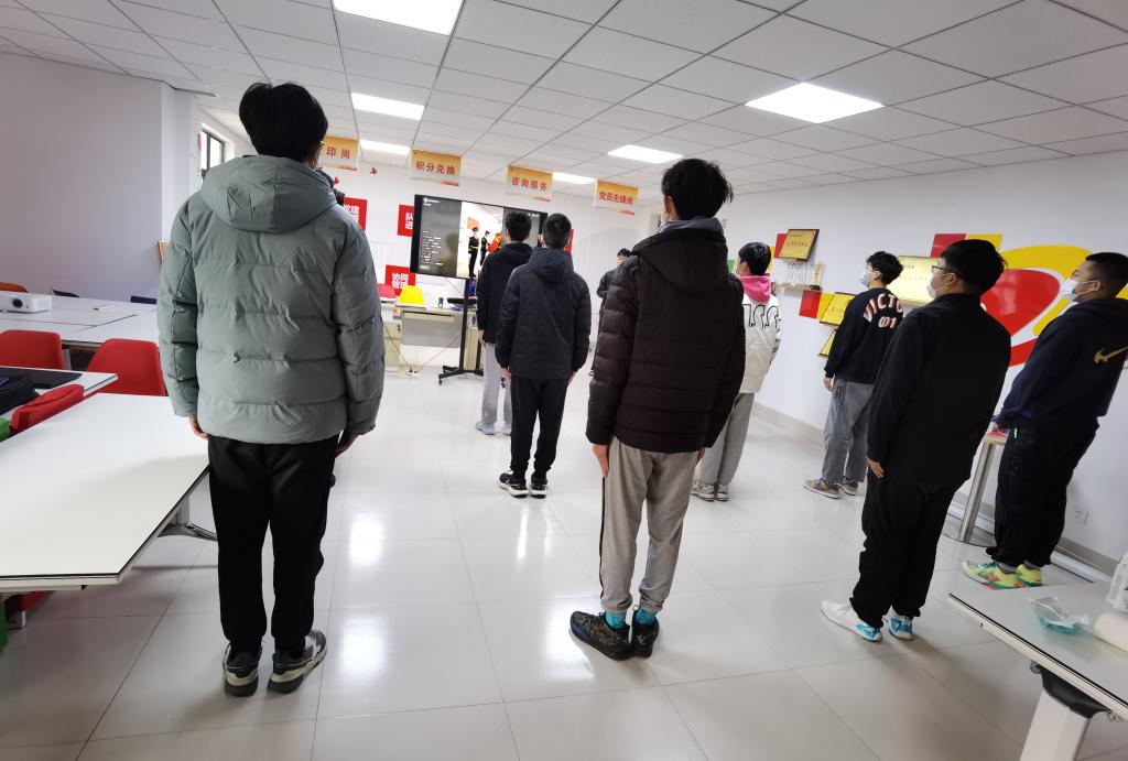 “请全体肃立,升国旗,奏唱国歌!”在仪仗队队长的口令下,伴随着雄壮的《义勇军进行曲》,五星红旗冉冉升起。学院全体青年学生在不同空间同时起身肃立,同唱国歌。