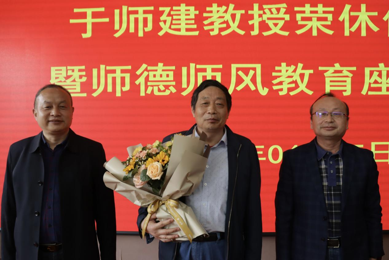 张恩生、程卫民为于师建教授献花、赠发纪念品并合影留念。