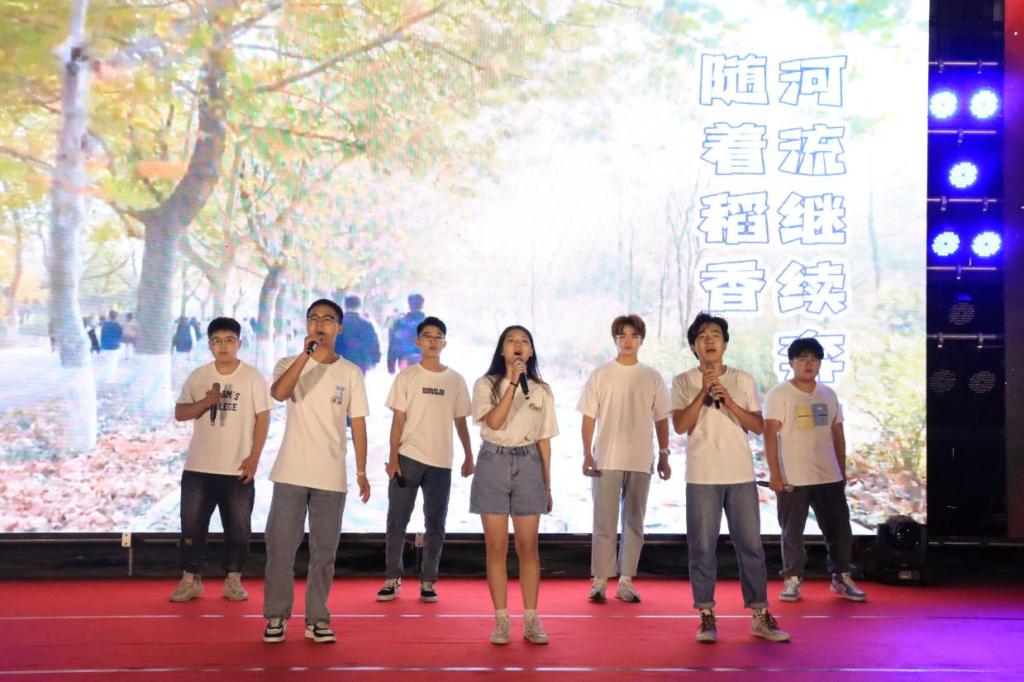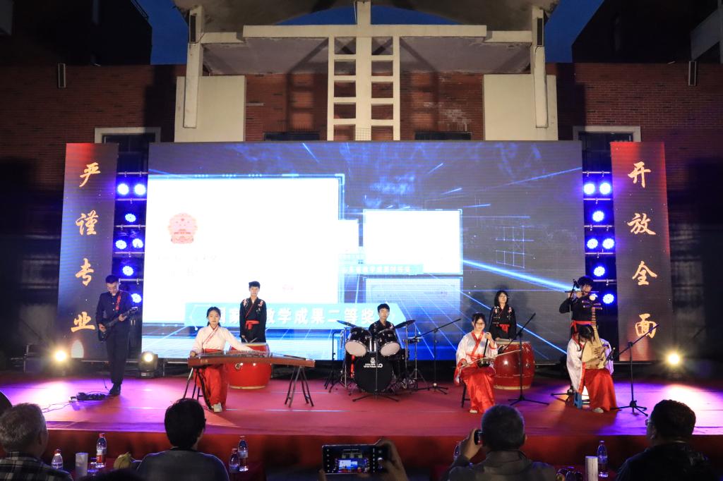 在器乐演奏《山水万程》舒缓动听的旋律中,晚会进入第二篇章“知行合一有情操”。毕业生张振兴、冯睿等演唱的歌曲串烧《回忆小夜曲》,带领大家走过校园的各个角落。教学楼、篮球场……他们含蓄地诉说着与这段时光的离别,用歌声记录青春,用回忆铺垫未来。“每个路口花都开在阳光里,小店门前传来好听的恋曲”,歌曲《平凡的一天》将大家的思绪带回青春奋斗的岁月里,激发了学生们爱校荣校、感恩母校的情怀。