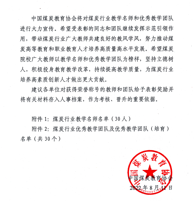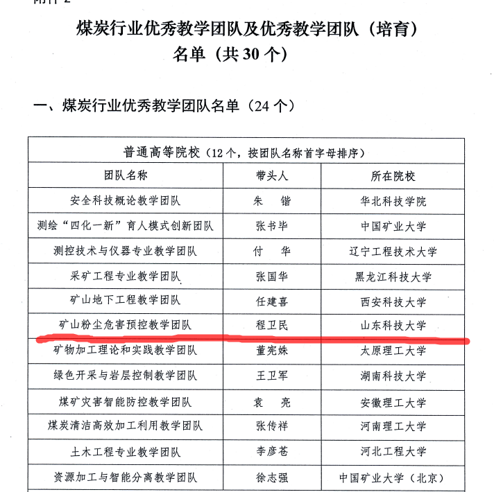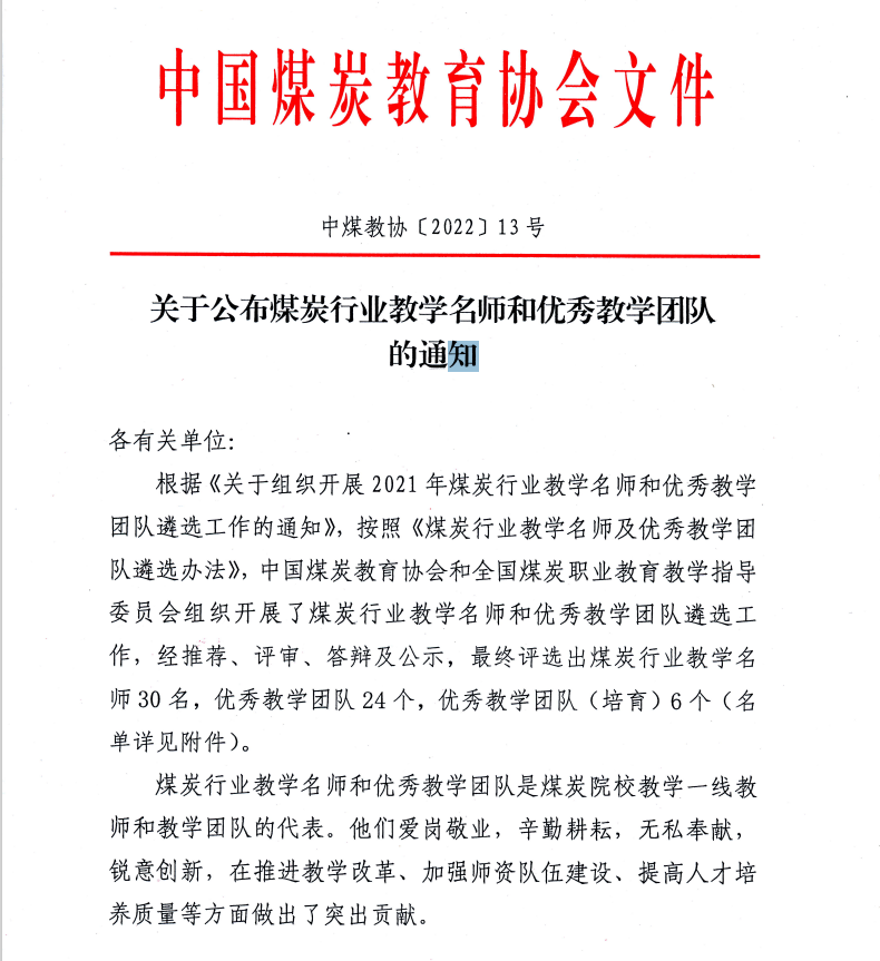 点击:近日,中国煤炭教育协会公布了2021年度煤炭行业教学名师和优秀教学团队遴选结果,按照《煤炭行业教学名师及优秀教学团队遴选办法》,中国煤炭教学协会和全国煤炭职业教育教学指导委员会组织开展了煤炭行业教学名师和优秀教学团队遴选工作,经推荐、评审、答辩及公示等环节,成人文学 程卫民教授负责的“矿山粉尘危害预控教学团队”成功入选全国煤炭行业优秀教学团队。