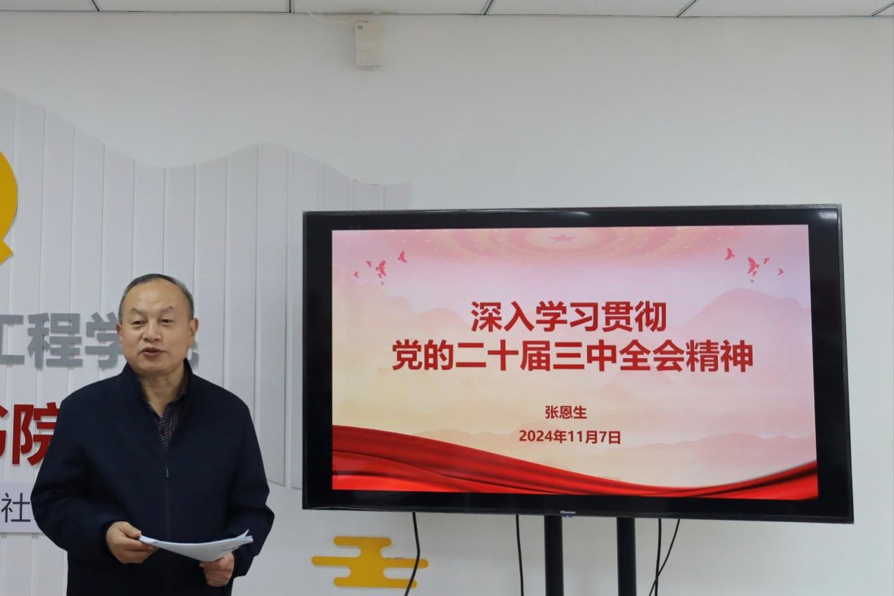 点击:为深入学习贯彻党的二十届三中全会精神,切实增强同学们的政治责任感和历史使命感,11月7日,成人文学 党委书记张恩生于GC4“一站式”学生社区-“领才书院”为联系班级学生作党的二十届三中全会精神宣讲报告。