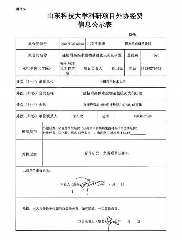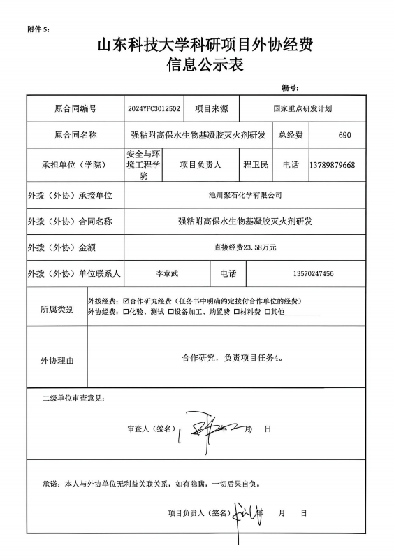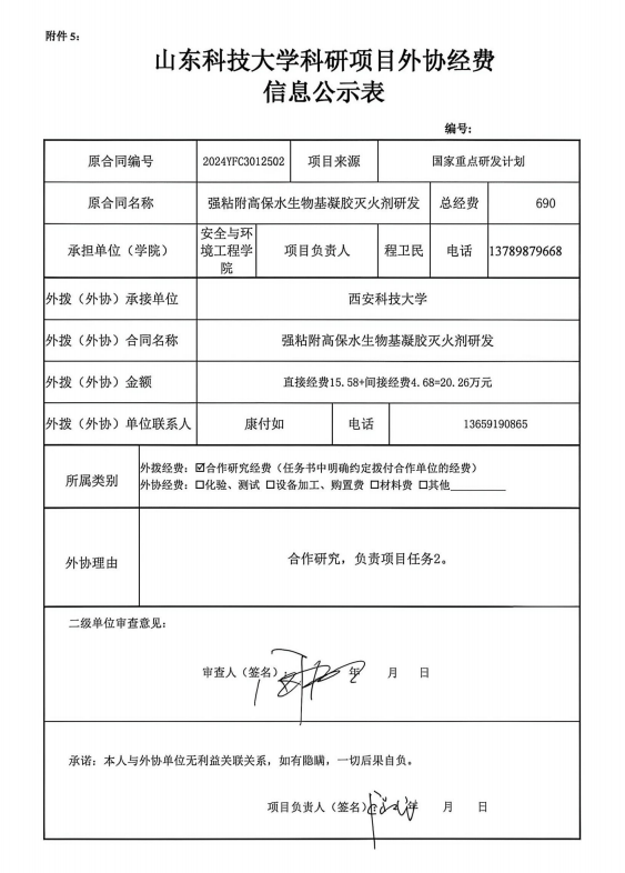 根据《山东省人民政府办公厅印发关于进一步完善财政科研项目资金管理的若干措施的通知》(鲁政办字〔2019〕120号)以及《成人文学 科研项目与经费管理办法(试行)》(山科大发〔2020〕64号)相关规定,现对程卫民为项目负责人的强粘附高保水生物基凝胶灭火剂研发项目的外协经费情况进行公示,公示时间为 2026年4月20日~2026年4月24日(公示时间不少于5个工作日)。若对本项外协经费有异议,请于公示期内向成人文学 或科技处反映并提交书面材料。