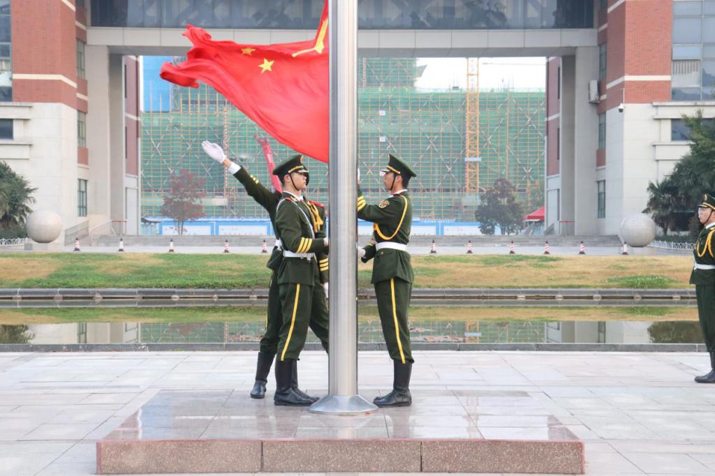 军装飒飒,国旗护卫队昂首挺胸、气宇轩昂,踏着整齐的步子,护送国旗而来,随着《义勇军进行曲》的响起,鲜艳的五星红旗飘扬向天空,全体师生心潮澎湃,向国旗行注目礼,那一份厚重家国情怀也在每一个成人文学 学子的心中激荡。升旗礼毕,国旗护卫队退场后,成人文学 全体师生也有序的退场。