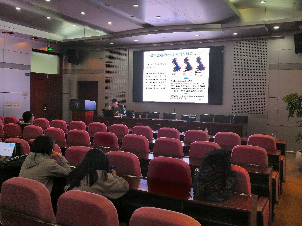 胡鹏首先介绍了相关的研究背景,此项研究主要致力于解决我国煤需求量不断增加和开采中的安全问题。从煤体微-细观结构测试方法、基于图像分析法的煤体结构分形研究这两个方面向同学们介绍了低渗煤层微细观结构分形特征。第二部分,胡鹏向同学们介绍了液渗-增润动力学机制。并展示了渗流的基本几何形式及基本规律--达西定律,系统地向同学们讲解了渗流模型。