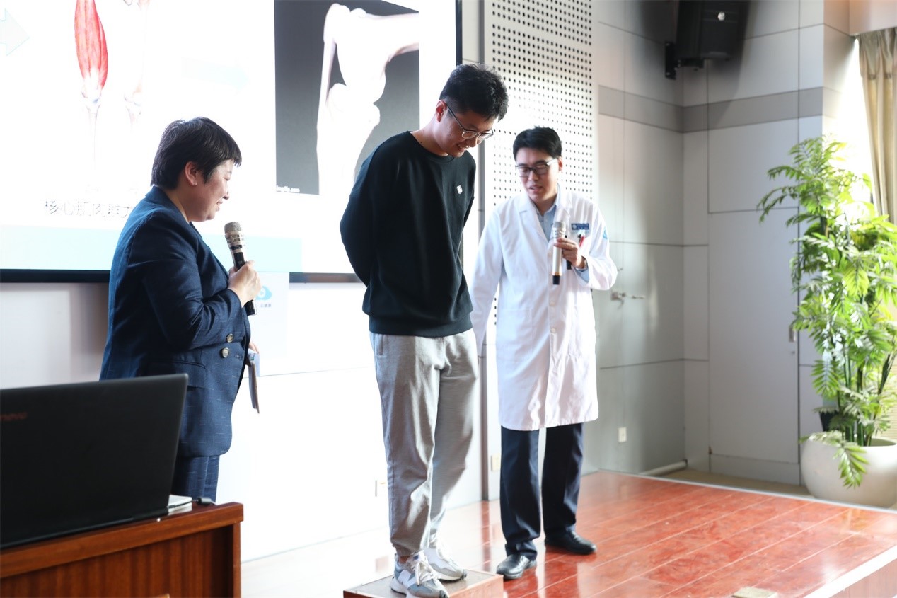 现场,李根通过亲身示范为大家介绍了膝关节自我检查方法和运动健康防护流程,为了能够让学生近距离感受体验。讲师团与师生互动,通过简单的肢体动作进行自我检查,将培训活动推向了高潮。并对同学们操作不规范的地方提出改进意见,使每位到场的同学都能规范掌握膝关节损伤自我检测方法。