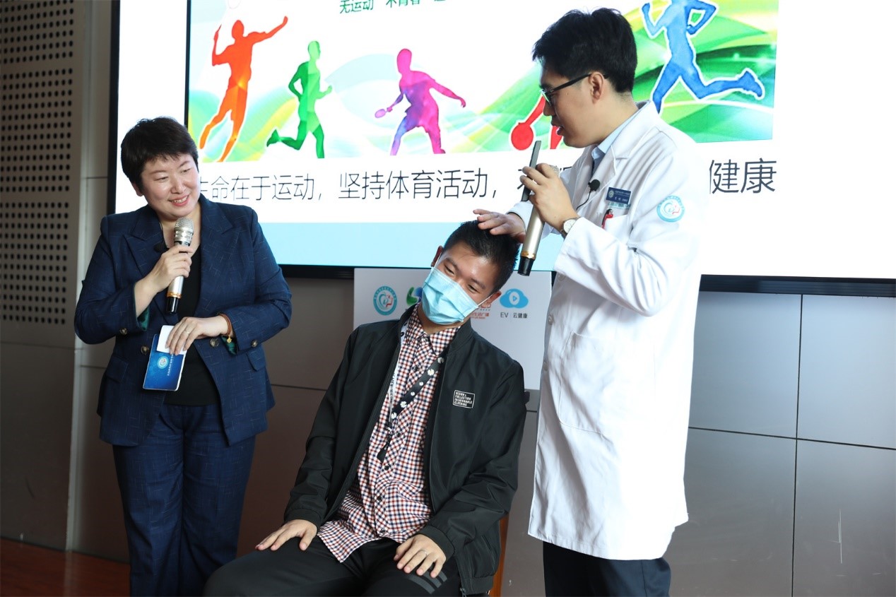 在培训过程中,李根讲师就骨健康知识进行了宣传与讲解,包括PPT演说,视频观看和现场示范等。李根讲师指出,日常工作生活例如久坐电脑等长时间保持一个状态导致的酸痛,在医学上不被称作颈椎病,如果能及时的休息和运动,能有70%以上的人不会患上颈椎病,因此李根着重介绍了肩颈部酸痛恢复训练方面的基本知识,“手把手”为大家演示肩颈部放松动作的具体操作以及动作要领。