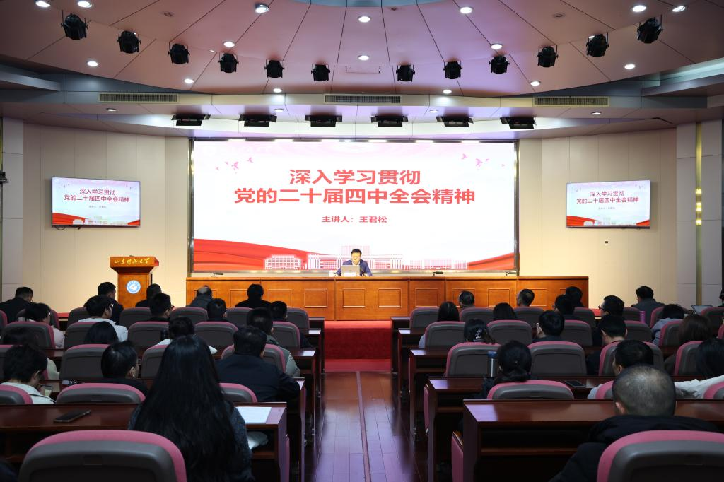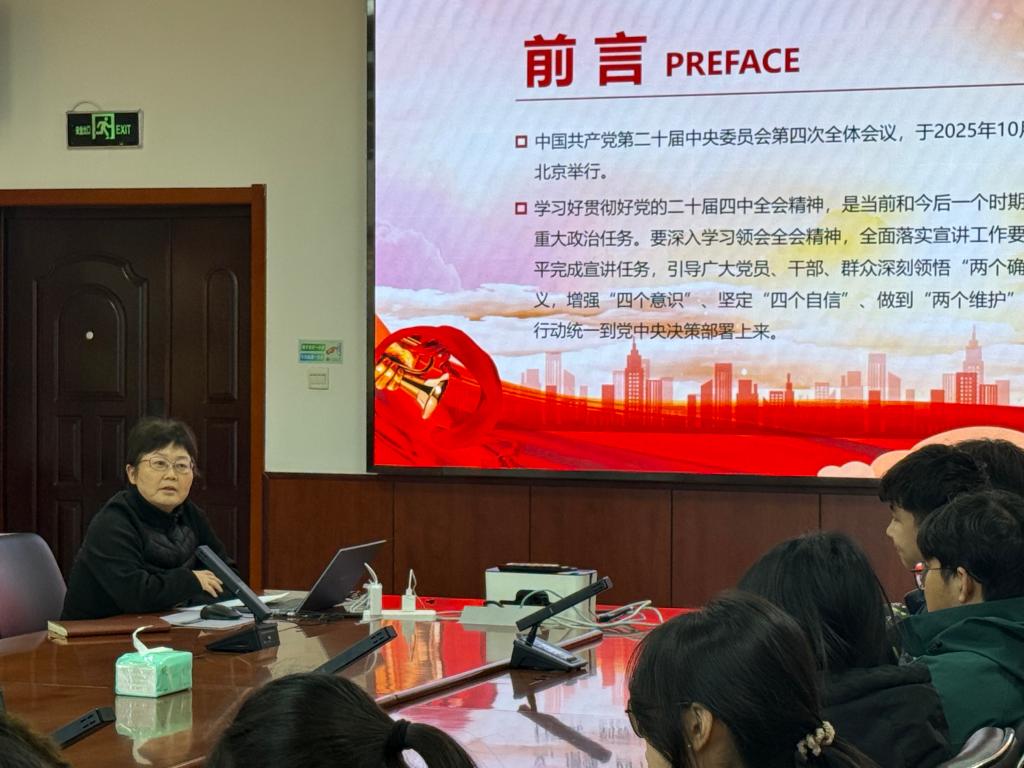 专题宣讲围绕党的二十届四中全会整体情况、准确把握“十五五”时期在基本实现社会主义现代化进程中的重要地位、深刻领会“十五五”时期经济社会发展的指导方针和主要目标、全面理解“十五五”时期经济社会发展战略任务和重大举措、坚持和加强党的全面领导五大方面展开,并结合省委十二届十次全会精神,重点回顾了山东省“十四五”时期重大成就,介绍了山东省“十五五”发展谋划,着重衔接了学校第四次党代会精神,以及新“三步走”战略、“六大战略”“八项任务”和“十大工程”发展规划,将国家战略、区域发展与学校事业、师生成长紧密结合。宣讲领导老师勉励全院师生深刻认识到自身所肩负的历史责任与时代使命,主动将个人成长融入国家发展大局,不仅要深学细悟全会精神的丰富内涵与实践要求,筑牢信仰之基,更要将学习成果转化为刻苦钻研、提升本领的内在动力,努力锤炼成为具备扎实学识、创新精神和担当能力的优秀人才。(编辑:冷冬阳 审核:王建友)