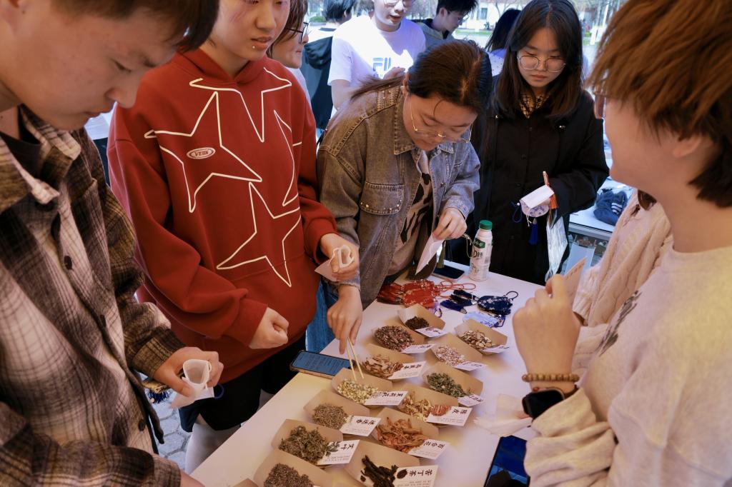 活动精心设置的四大特色体验项目,让传统民俗与春日雅趣相融。漆扇区中,同学们以扇面为纸、漆墨作画,勾勒花鸟、题写诗词,于方寸间致敬千年匠心;投壶区里,众人凝神屏息、瞄准投掷,在一招一式中切磋技艺,喝彩声此起彼伏,犹见古时“君子之争”的从容风仪;拓染区以校园花草为材,将花瓣叶片精心排布于织物之上,以小锤轻敲固色,将转瞬春景定格,正应了“草木有本心”的自然之趣;香囊区内艾草清香萦绕,同学们自主搭配香材、细心缝制装饰,将驱虫避秽、祈福纳吉的美好祝愿装入小小的香囊之中。