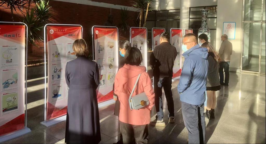 点击:为进一步加强党纪党规宣传教育,浓厚校园廉洁文化氛围,以风清气正的政治生态,迎接党的二十大胜利召开,10月10日,应急管理工程系党支部组织党员参观《漫画说纪》党纪党规教育展。本次教育展以漫画的形式对《中国共产党纪律处分条例》内容逐条进行解读,共展出漫画143幅,分26个展板。展板形式新颖活泼,内容生动形象,便于党员学习理解。支部党员们在画架前驻足观读,交流讨论,进一步深刻理解并牢记《中国共产党纪律处分条例》内容。