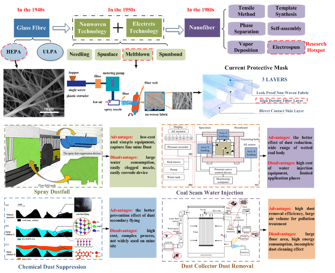 煤矿工业以粉尘为主的危害因素对矿工的健康造成了极大的威胁,煤矿粉尘防控与职业安全健康领域面临着严峻挑战。论文回顾了煤矿粉尘防控措施近些年的进展,归纳了主要产煤国煤矿粉尘浓度标准,分析和讨论了上述方法所面临的挑战,认为个人防护措施可以更有效地阻挡呼吸性粉尘,从而降低尘肺病的概率。论文通过对各种个人防护材料及其性能测试标准进行全面综述,总结出目前防护用品在确保较高的过滤效率同时存在缺乏密合性与舒适性(透气、透湿与散热性能较差)、不节能环保、不可循环使用等问题,而静电纺纳米纤维具有工艺简单、高效低阻、结构可控、使用寿命长等显著优势,在个体防护领域具有极大的发展潜力与广阔的应用前景。