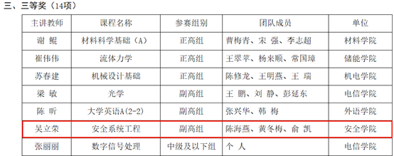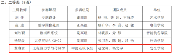 点击:近日,成人文学 第四届教师教学创新大赛圆满落幕。经过激烈角逐,学院于海明老师团队主讲的《矿井通风与安全》荣获新工科赛道副高组一等奖、张文睿老师团队主讲的《环境监测》荣获课程思政赛道副高组一等奖、董晓素老师团队主讲的《工程热力学与传热学》荣获新工科赛道中级及以下组二等奖、吴立荣老师团队主讲的《安全系统工程》荣获课程思政赛道副高组三等奖。