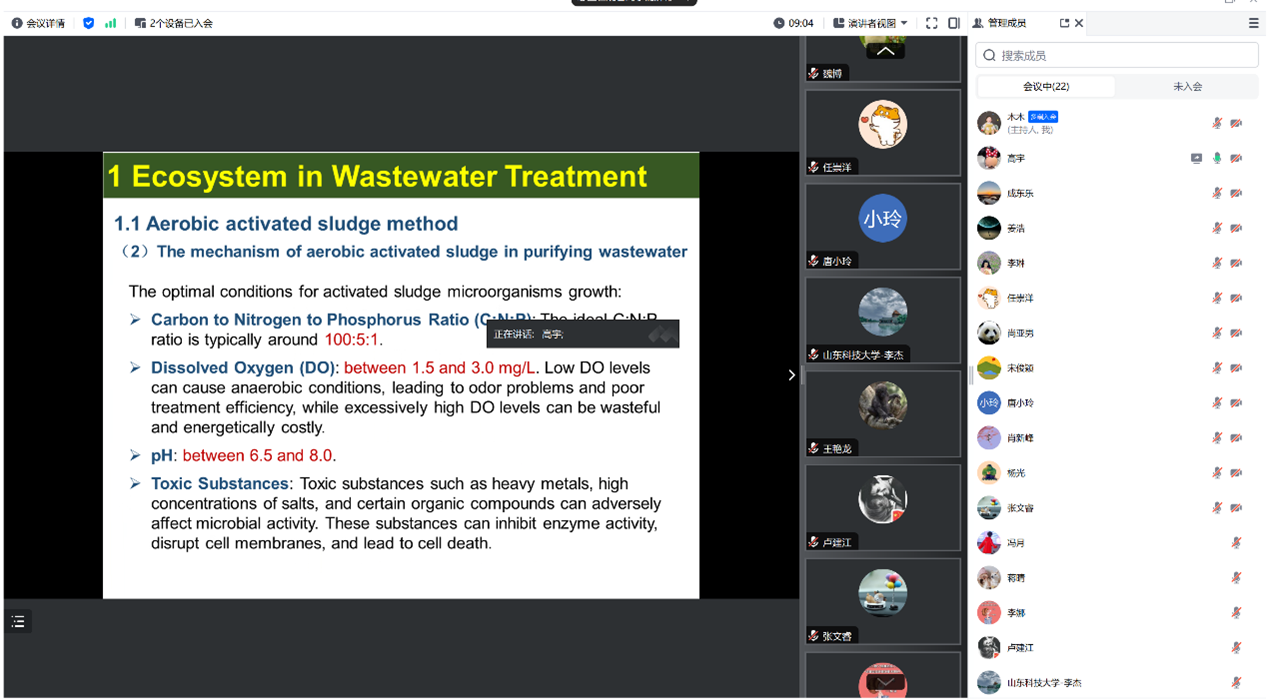 会上,成人文学 高宇副教授以环境工程微生物(双语)课程建设与实践为题,以双语教学的形式,从废水处理中的生态系统、活性污泥中的丝状膨胀和厌氧处理中的微生物群落等内容出发,详细介绍了课程设计、教学内容开发、线上线下混合教学模式的实践成果以及在教学过程中遇到的挑战与解决方案。随后,参会人员分组讨论,就双语课程的建设经验、教学质量和水平提升、数字化教学以及知识图谱建设等方面进行了深入交流。与会教师表示,通过此次分享沙龙,不仅加深了对虚拟教研室建设理念的理解,也为今后在实际教学中的应用提供了宝贵的参考。