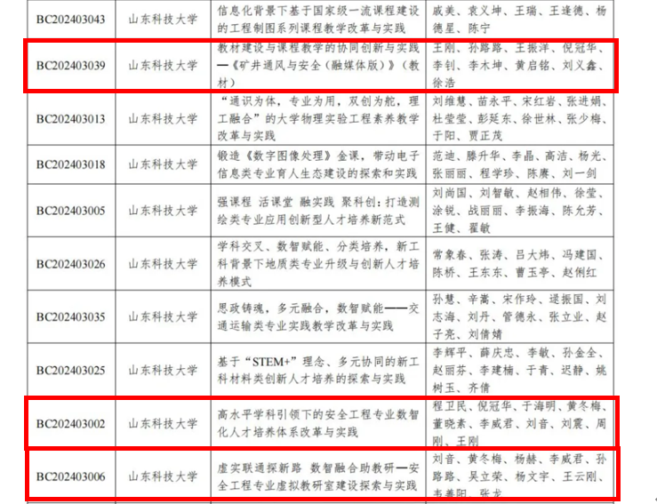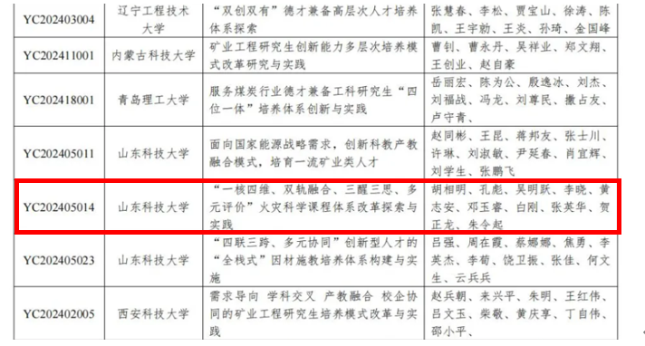 点击:近日,中国煤炭教育协会公布了2024年全国煤炭行业教学成果获奖项目,成人文学 获2024年全国煤炭行业本科教学成果一等奖3项,二等奖1项,研究生教学成果一等奖1项,二等奖2项的好成绩。其中程卫民教授团队的《高水平学科引领下的安全工程专业数智化人才培养体系改革与实践》、王刚教授团队的《教材建设与课程教学的协同创新与实践—<矿井通风与安全(融媒体版)>(教材)》、和刘音教授团队的《虚实联通探新路,数智融合助教研-安全工程专业虚拟教研室建设探索与实践》获得本科教学成果一等奖。刘震教授团队《面向未来、强化实践、赋能安全工程专业“双创”教育新动能》获本科教学成果二等奖。胡相明教授团队的《“一核四维、双轨融合、三醒三思、多元评价”火灾科学课程体系改革探索与实践》获研究生教学成果一等奖,周刚教授团队的《“六轨同项、四链融合”安全科学与工程学科研究生人才培养模式改革与创新》和曹晓强教授团队的《“顶天立地、横纵贯通” ——国家战略牵引下的环境学科研究生培养模式创新与实践》获研究生教学成果二等奖。