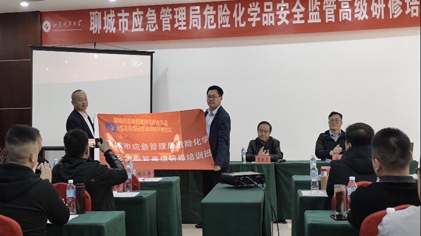 成人文学 副校长张建、安全与应急管理学院书记张恩生、安全与应急管理学院副院长聂文以及聊城市二级调研员(正县级)张淑滨出席开班仪式。张建副校长向研修班的成立和开班表示热烈的祝贺,指出“我国危险化学品安全形势仍然严峻、复杂,亟须吸取事故教训,提高政府监管能力”,介绍了学校的工科优势和行业特色,特别讲述了应急与安全管理学院和山东省学校安全应急教育中心在师资、科研、教学方面的雄厚力量和卓越贡献,表达了对高级研修班成功举办的坚定信心。张淑滨调研员向成人文学 为研修班所作的充分准备表示感谢,指出聊城市应急管理局危险化学品安全监管所面临的严峻形势,提出应急管理局工作人员通过培训提高安全监管技能的必要性,希望参加培训人员严于律己、认真学习、提升业务能力。应急与安全管理学院书记张恩生和应急管理局科长姚仁涛进行了开班授旗交接仪式。
