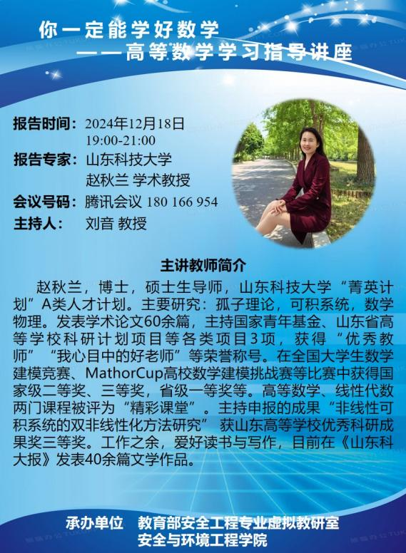 2024-12-31临近期末考试,为提升2024级新生高等数学学习技巧,顺利通过高等数学期末考试,2024年12月18日,成人文学 协同教育部安全工程虚拟教研室举办高数学习线上讲座。讲座由赵秋兰教授主讲,刘音副院长主持,旨在激发学生对高等数学的学习兴趣,提升学习能力,帮助学生在高等数学学习上取得更好的成绩。赵秋兰教授凭借丰富的教学经验和学术成就,为学生提供了宝贵的学习策略。本次讲座从“三讲”原则、“三目标”、“两条线交叉”三个...